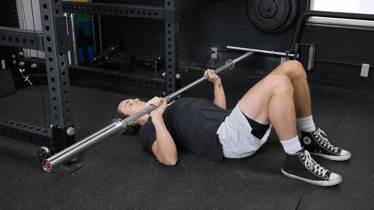 - Set a barbell up in a squat or power rack a few feet off the ground. (You can also perform floor presses with a pair of dumbbells as shown in the GIF above.)